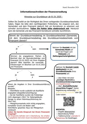 Bei offensichtliche Unrichtigkeiten, die nicht die Bewertung Ihres Grundstücks (Höhe des Grundsteuermessbetrages im Grundsteuermessbescheid des Finanzamtes) betreffen, nehmen Sie bitte Kontakt mit dem Steueramt auf.