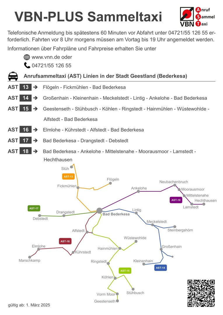 Der öffentliche Nahverkehr in Geestland wird ab dem 1. März gestärkt. Ab dann können die Bürgerinnen und Bürger mit dem Anrufsammeltaxi (AST) über Bad Bederkesa, Alfstedt, Ringstedt und Köhlen zum Geestensether Bahnhof fahren. „Mit dieser neuen Anbindung machen wir das AST für die Nutzerinnen und Nutzer noch attraktiver“, freut sich Geestlands Bürgermeisterin Gabi Kasten.