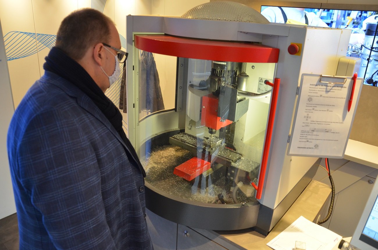 Gebannt blickt Thorsten Krüger durch die Glasscheibe der computergesteuerten Fräsmaschine. Metallspäne fliegen umher, der Bohrer hebt und senkt sich. Nur wenige Minuten später hält Thorsten Krüger das fertige Ergebnis in den Händen: ein Metallstück mit eingraviertem Anker. Geestlands Bürgermeister lächelt: „Ein tolles Gefühl, am Ende etwas in der Hand zu halten, was man selbst hergestellt hat.“ Und genau das ist das Ziel des M+E-Trucks, der noch bis Mittwoch an der Oberschule Langen steht: Er will Begeisterung wecken für Berufe in der Metall- und Elektroindustrie. Eine Branche, die händeringend nach Fachkräften sucht.