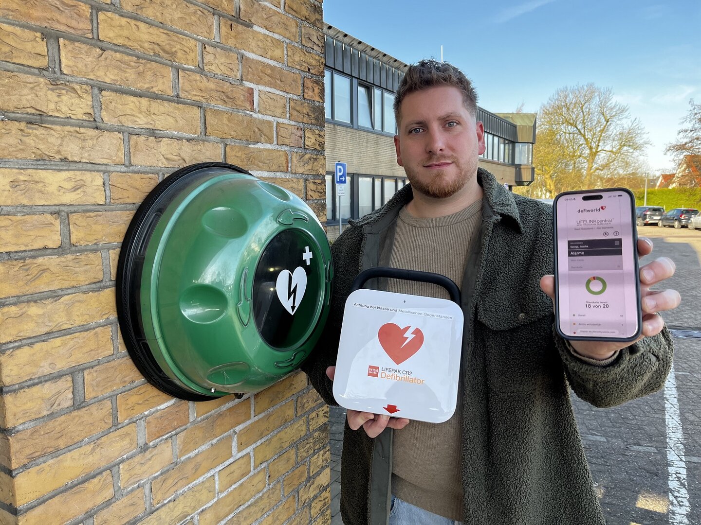 Verwaltungsmitarbeiter Jascha Georgi zeigt einen smarten Defibrillator Ein wichtiger Schritt zur Verbesserung der medizinischen Notfallversorgung im ländlichen Raum: Die Stadt Geestland hat vor Kurzem insgesamt 21 von 24 stadteigenen Defibrillatoren durch smarte Geräte ersetzt.