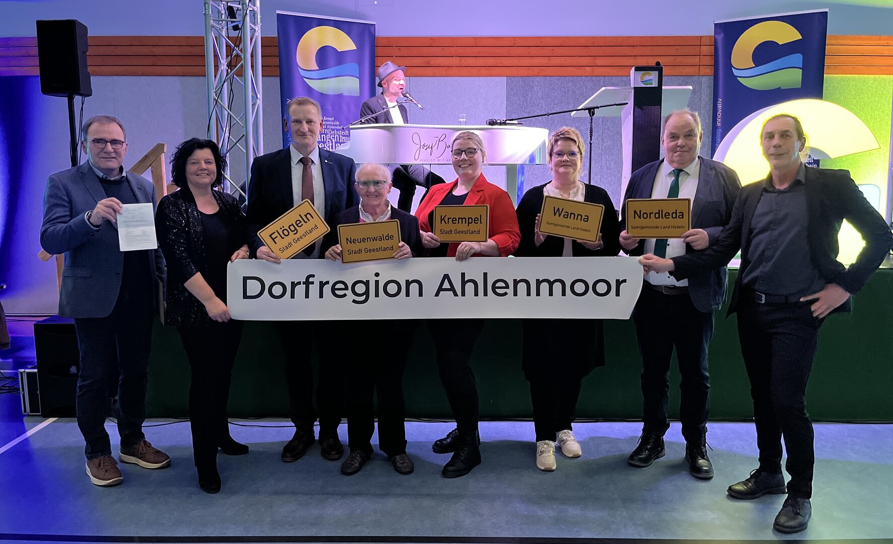 Vertreterinnen und Vertreter aus Geestland und Land Hadeln mit Lienhard Varoga vom ArL Der Neujahrsempfang der Stadt Geestland in der Elmloher Geestland-Halle war in diesem Jahr besonders unterhaltsam – und überraschend! Zauberer Alexander Treville sorgte für magische Momente und bewies eindrucksvoll, dass aus einem Zylinder nicht nur Kaninchen kommen müssen: Auf der Bühne zauberte er den Antrag der Dorfregion Ahlenmoor zur Aufnahme in das Dorfentwicklungsprogramm hervor.