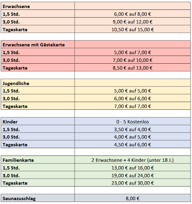 Die Anpassung der Tarife tritt am 1. Januar 2026 in Kraft. Erwachsene zahlen dann für 1,5 Stunden 8 Euro statt wie bisher 6 Euro. Die Kosten für eine Tageskarte (Erwachsene) steigen von 10,50 auf 15 Euro. Leichte Änderungen gibt es auch bei den Eintrittspreisen für Kinder: Hier kostet zum Beispiel ein 1,5-Stunden-Ticket 4 statt 3,50 Euro. Kinder bis 5 Jahre kommen auch weiterhin kostenlos in die Moor-Therme. Familien zahlen für 1,5-Stunden ab dem neuen Jahr 16 statt 13 Euro. Eine Tageskarte erhalten sie für 30 Euro. Diese hat vorher 23 Euro gekostet. Die Tarife für Jugendliche sind von den Preisanpassungen ausgenommen. Gleiches gilt für den Saunazuschlag, der auch in Zukunft bei 8 Euro liegt. Dieser wird wie gewohnt zum „normalen“ Eintrittspreis für die Moor-Therme dazugerechnet.