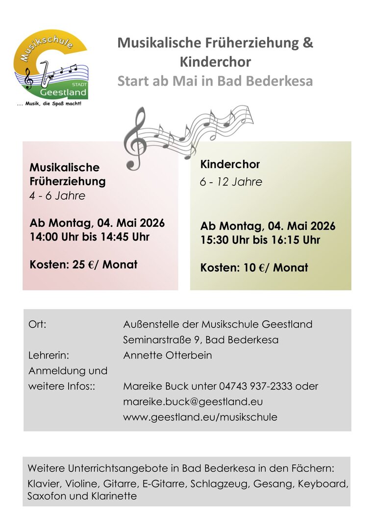 Am selben Tag startet in der Musikschule außerdem ein neuer Kinderchor von 15.30 bis 16.15 Uhr in Bad Bederkesa. Dieser richtet sich an alle Kinder im Alter von 6 bis 12 Jahren und wird ebenfalls von Frau Otterbein geleitet.