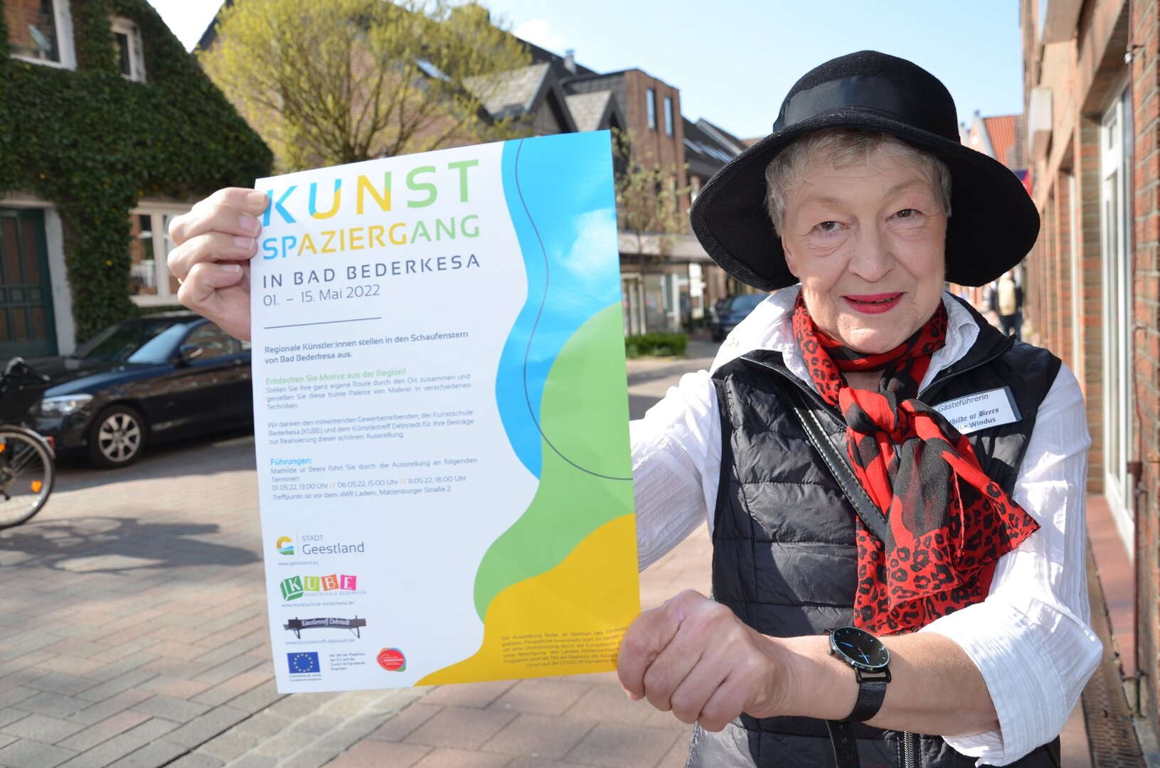 Wer den Kunstspaziergang gerne in einer Gruppe mit anderen Interessierten erleben möchte, kann sich auch einer Führung anschließen. Und die übernimmt niemand Geringeres als Heike Windus alias Mathilde ut Beers, die für ihre Ortsführungen durch Bad Bederkea berühmt ist. An drei Terminen wird sie die Teilnehmenden durch die Ortsmitte führen, mit ihnen gemeinsam einen Blick auf die Kunstwerke werfen und – wie man es von ihr kennt – unterhaltsame Geschichten zum Besten geben.